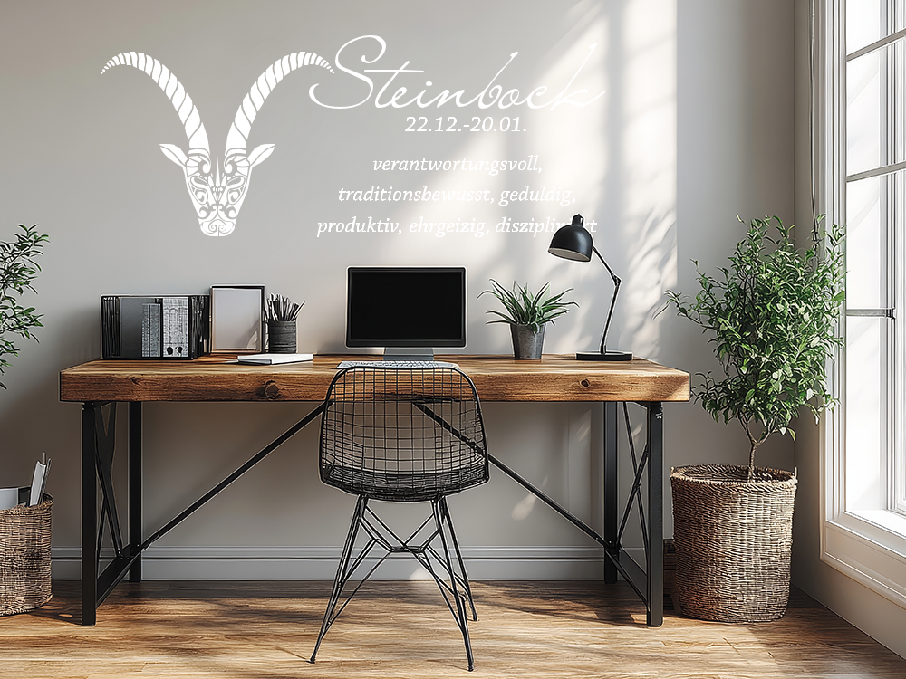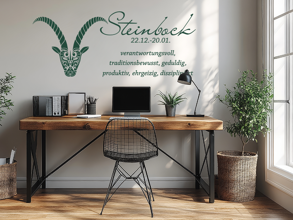 Menschen mit dem Sternzeichen Steinbock gelten als zielstrebig, konzentriert und gründlich. Ein Wandtattoo mit Steinbock ist für Steinbock-Menschen wohl die gründlichste Art, um ihr Innerstes im Wohnbereich nach außen zu tragen und jedem Besucher auf den ersten Blick zu zeigen, mit wem er es zu tun hat.