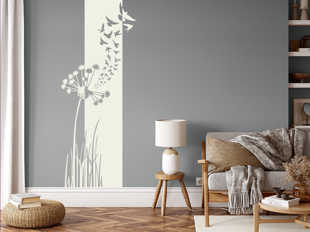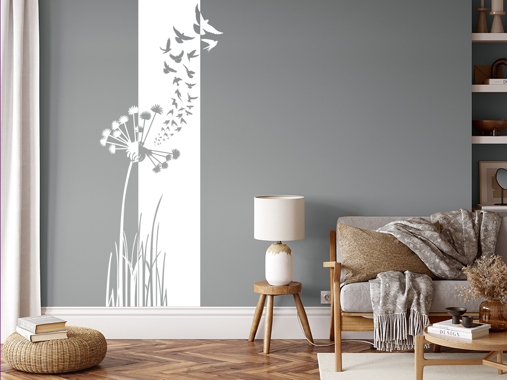 Die perfekte Wandgestaltung für den Eingangsbereich ist dieses Wandtattoo. Der maßgefertigte, geschmackvolle Banner mit Pusteblume, Gräsern und davonfliegenden Vögel imponiert jedem Betrachter und verleiht der Wand einen fantastischen Akzent. Selbstverständlich eignet sich dieser Sticker auch zur Dekoration in jedem Raum der eigenen Wahl. Das Design passt zu jedem Einrichtungsstil und verschmilzt damit zu einem einzigartigen Wohnkonzept. Mit einer persönlich gestalteten Wohnung wird die komplette Atmosphäre verbessert und der Wohlfühlcharakter gesteigert, weshalb es sich definitiv lohnt, der Kreativität freien Lauf zu lassen und die eigenen vier Wände nach dem persönlichem Geschmack zu dekorieren.