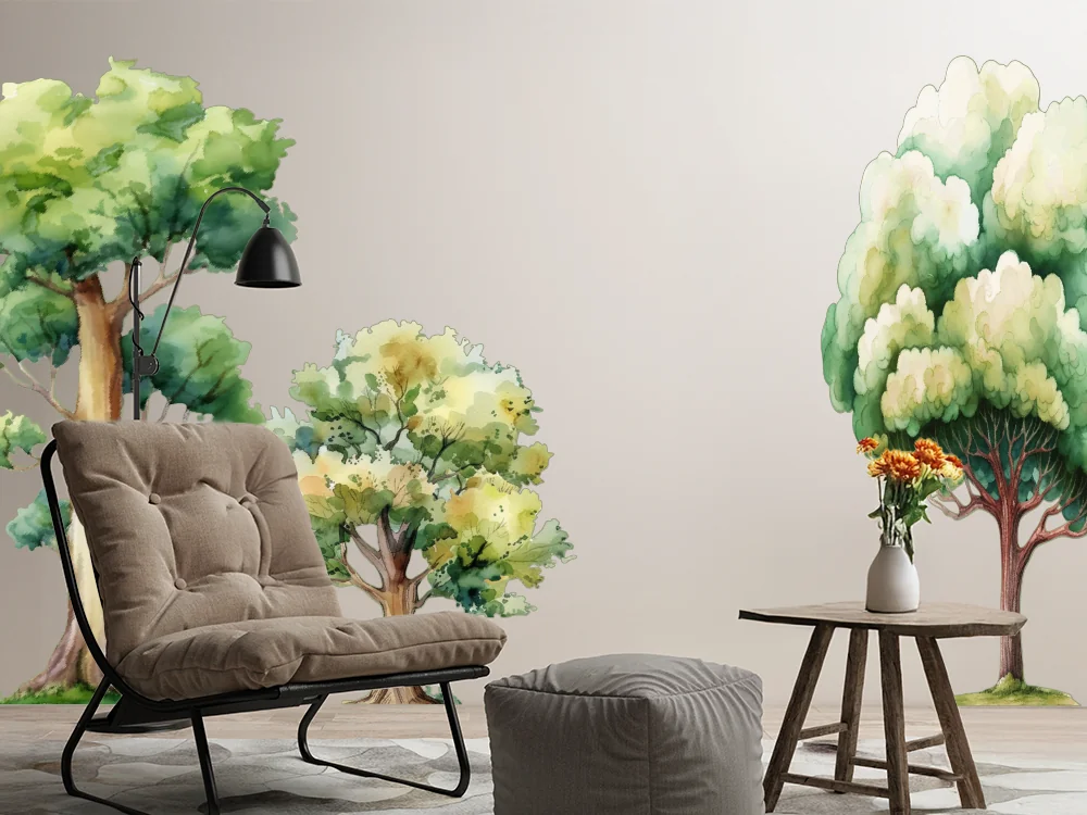 Dieses Set aus drei Bäumen mit unterschiedlichen Höhen in Aquarell-Optik schafft eine harmonische Atmosphäre