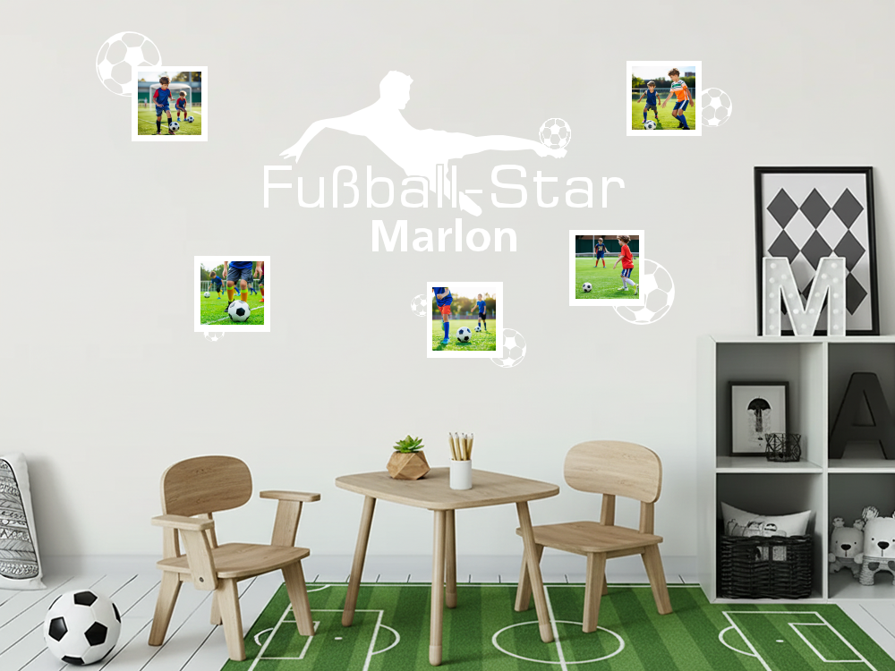 Setzen Sie Ihrem kleinen Fußball-Star mit diesem Aufkleber für die Wand im Kinderzimmer ein Denkmal. Die mitgelieferten 8 Rahmen, die wie das Wandtattoo selbst aus einer hochwertigen Klebefolie bestehen, bieten Platz für die schönsten Bilder und Erinnerungen.
