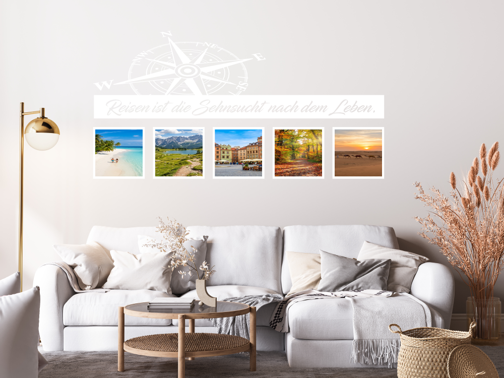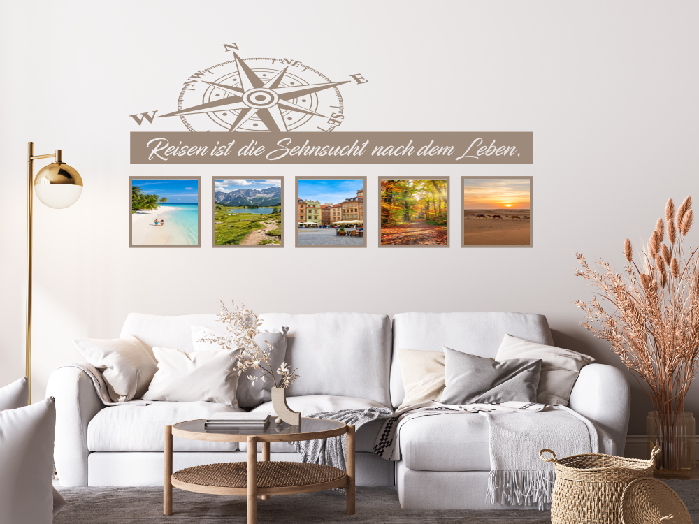 Reisen ist die Sehnsucht nach dem Leben. Dieser tolle Spruch kombiniert mit einem Kompass kann die Erinnerungen an vergangene Reisen gekonnt in Szene setzen. Das Wandtattoo mit Fotorahmen ist eine außergewöhnliche und stilvolle Alternative zu herkömmlichen Bilderrahmen und lässt Ihre Fotos noch besser zur Geltung kommen.