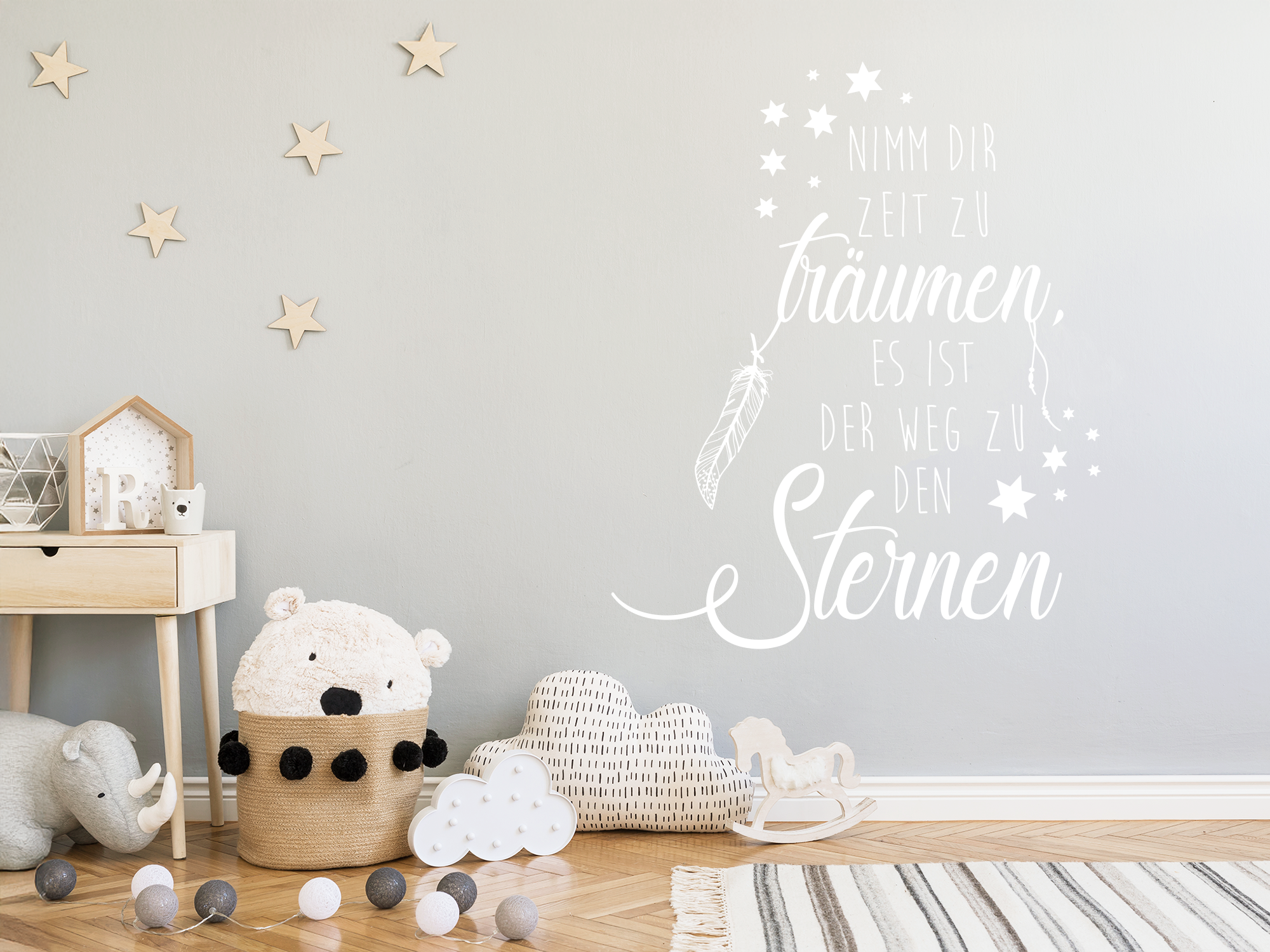 Halten Sie einen Moment inne, nehmen Sie sich eine Pause und lassen Sie Ihren Träumen freien Lauf. Dieser wunderbare Spruch lässt Sie genau das tun. Bringen Sie das Wandtattoo über Ihrem Sofa oder Ihrem Bett an und kreieren Sie sich dadurch eine wundervolle Stimmung. Sie werden sehen, dass Sie mit der richtigen Dekoration leichter zur Ruhe kommen und sich vor allem viel wohler fühlen. Die grandiose Wirkung des Wandspruchs wird durch die Feder und die kleinen Sternchen unterstützt. Träume sind oftmals der Schlüssel zum Erfolg und tiefem Glück. Also: Träumen Sie.
