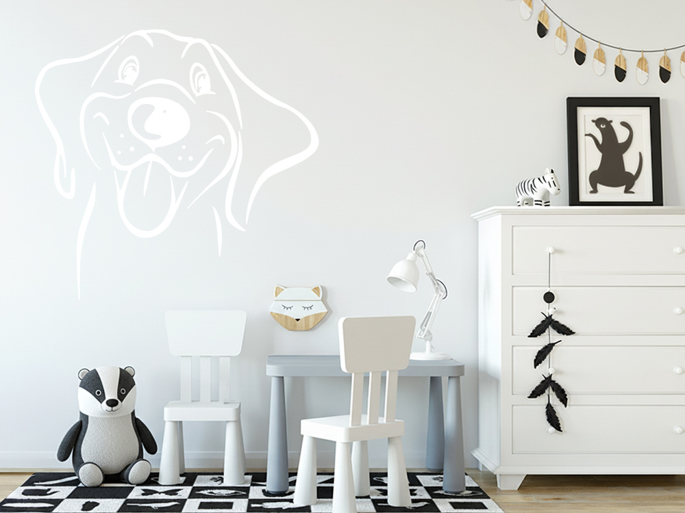 Dieser niedliche Hund ist ein toller Blickfang an der Wand. Das Wandtattoo ist eine schöne Idee um beispielsweise ein Kinderzimmer optisch aufzuwerten und etwas ganz Besonderes aus diesem Zimmer zu machen. Der Hund, als der beste Freund des Menschen, wird als Aufkleber an der Wand für eine fröhliche und freundliche Stimmung sorgen, von der Sie täglich profitieren. Als Betrachter erkennt man sofort die Begeisterung für die Tierwelt, insbesondere die des Hundes. Das Wandtattoo lässt sich schnell und mühelos an der Wand anbringen.