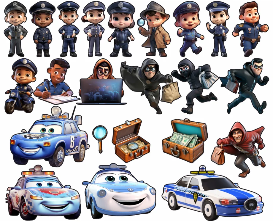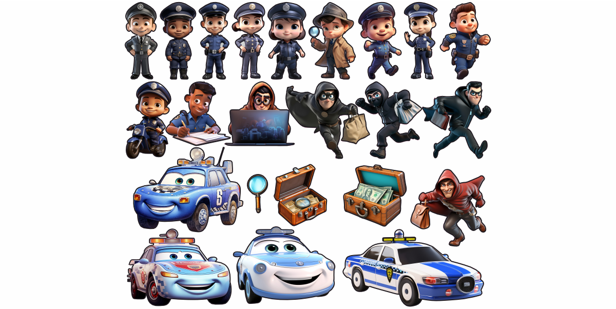 Lustige Polizeiautos, Räuber, Geldkoffer und zahlreiche Mini-Polizistinnen umd Mini-Polizisten
