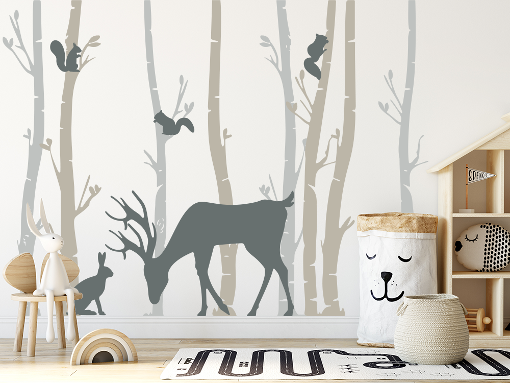- Mehrfarbige Birkenstämme mit Eichhörnchen, Hase und Hirsch
