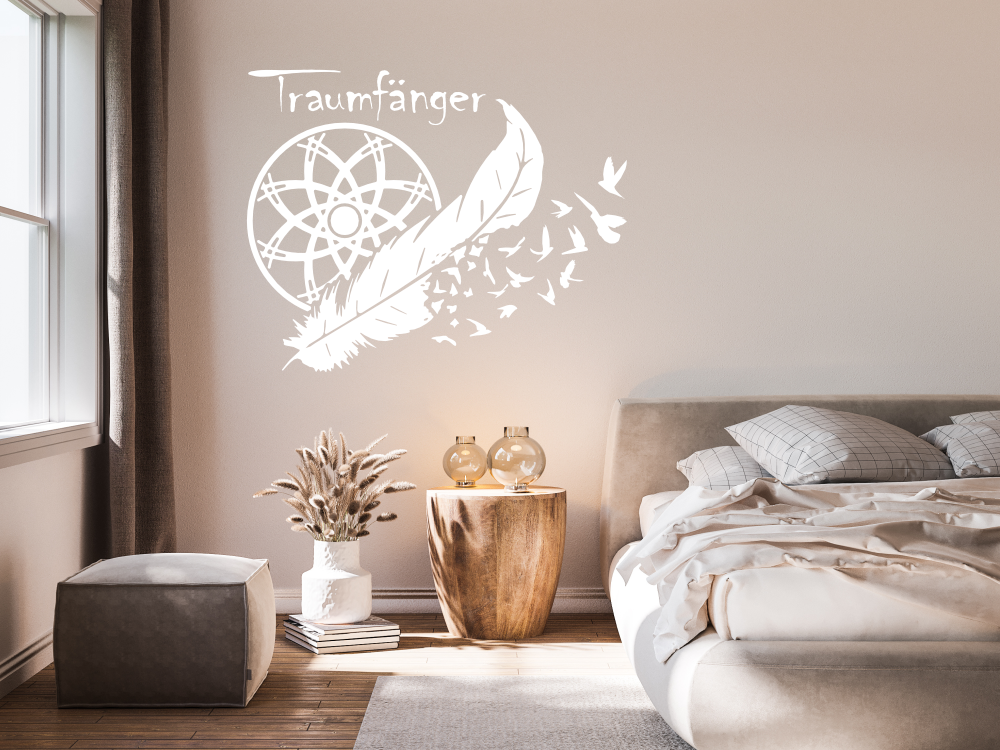 Die Feder mit den davonfliegenden Vögeln und dem kunstvoll gestalteten Ornament kann einen Raum zu einer absoluten Wohlfühloase umgestalten. Kreieren Sie sich einen Ort, an dem Sie zur Ruhe kommen und an dem Sie richtig gut schlafen können. Lassen Sie sich zum Träumen einladen und genießen Sie dank diesem wirkungsvollen Designs eine wahrhaft traumhafte Atmosphäre. Dem Glauben nach, sollen Traumfänger vor schlechten Träumen schützen und den Schlaf verbessern. Um die Gemütlichkeit in Ihrem Schlafzimmer zu erhöhen, bringen Sie das Wandtattoo über Ihrem Bett an. Sie werden sofort spüren, wie wohl Sie sich in einem kreativ eingerichteten Raum fühlen. Das Motiv harmoniert ganz bestimmt auch mit Ihrer restlichen Einrichtung.