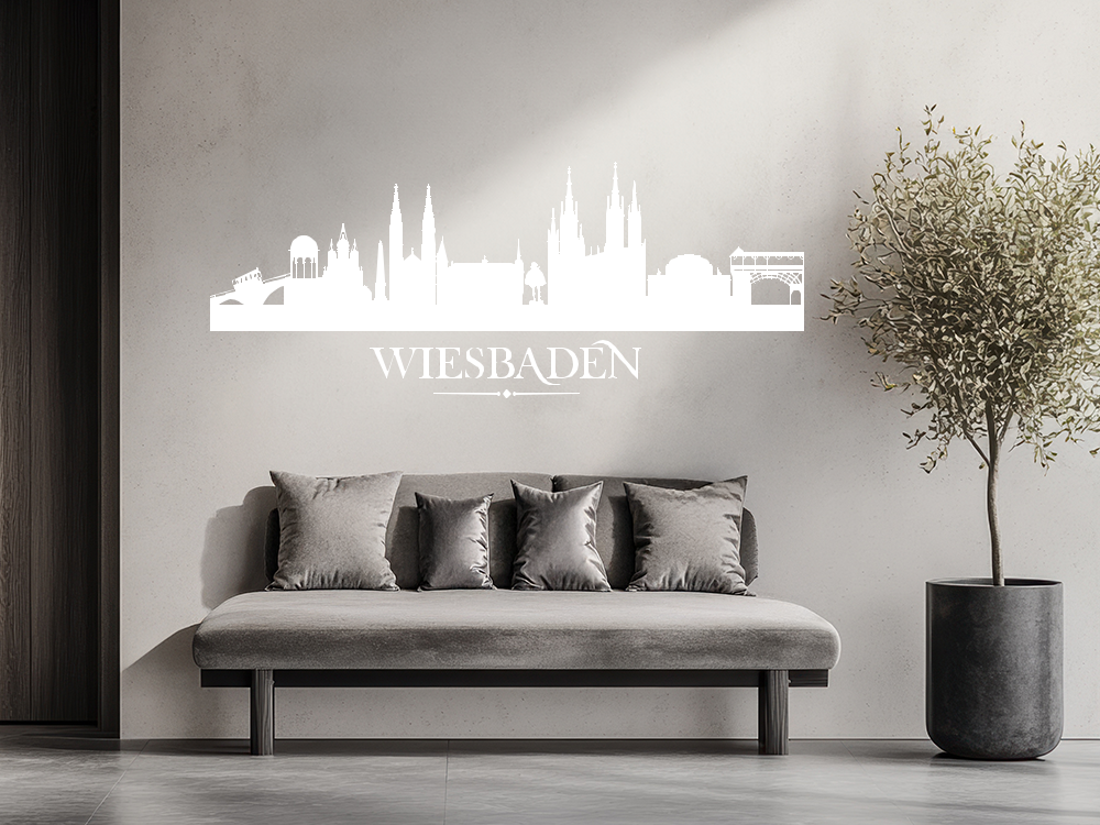 Die Skyline von Wiesbaden mit nur einigen der bekanntesten Sehenswürdigkeiten wie zum Beispiel der Marktkirche, dem Neroberg-Tempel, der Nerobergbahn oder der Heidemauer mit Römertor ist als Wandtattoo ein einfallsreicher Hingucker. Leere Wände können damit im Handumdrehen verschönert werden und der Charakter des Raumes wird obendrein im Gesamten positiv beeinflußt. Dank der einfachen Montage kann dieser Aufkleber für die Wand auch schnell und einfach durch Laien angebracht werden.