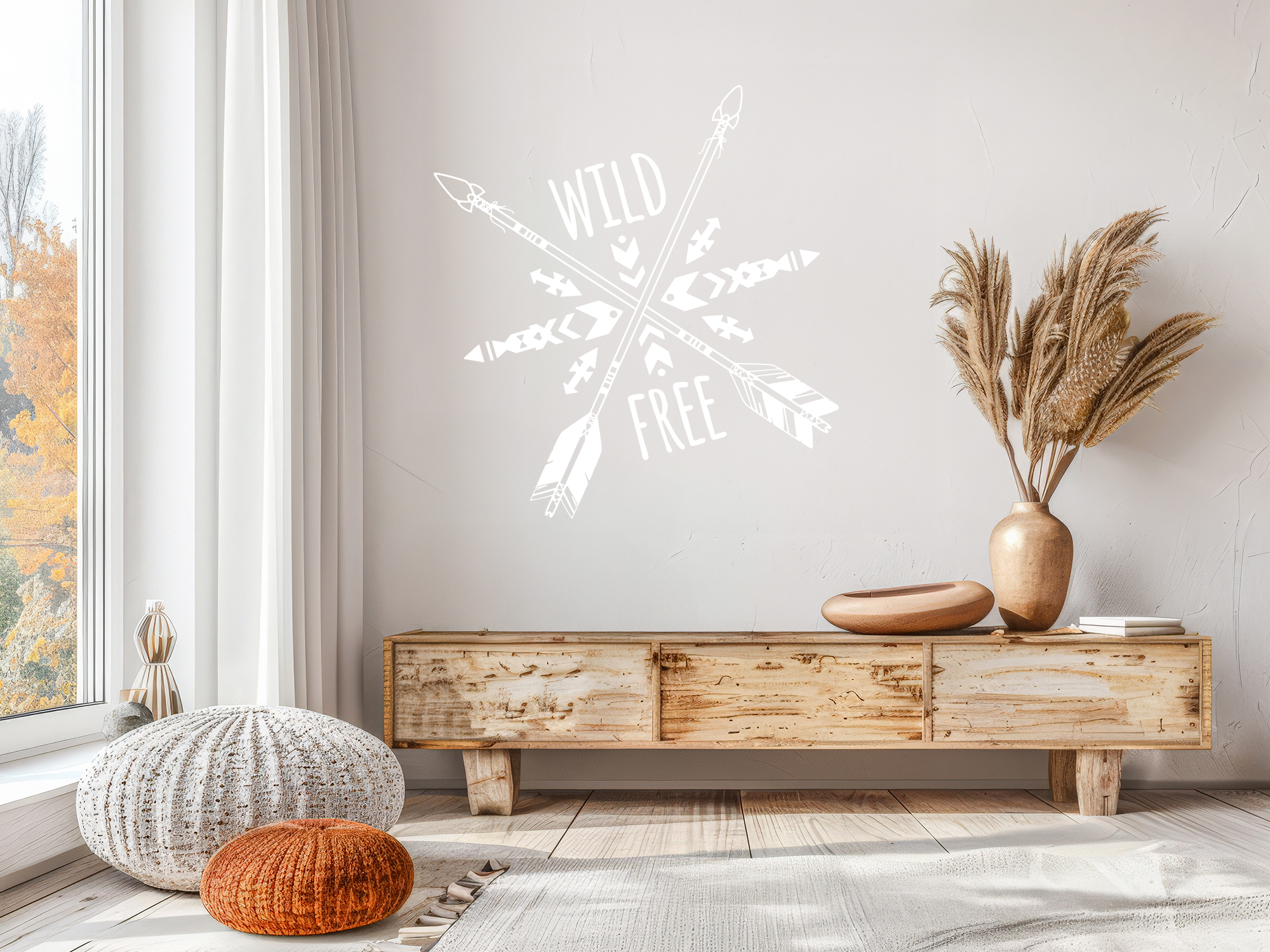 Wer die eigenen Wohnräume individuell gestalten möchte, der sollte sich dieses dekorative Wandtattoo einmal genauer ansehen. Die Worte "Wild and Free" verziert mit dekorativen Indianerpfeilen bilden ein Motiv, mit dem man sich den angesagten Boho-Look ganz einfach nach Hause holen kann. Lassen Sie Ihrer Kreativität freien Lauf und gestalten Sie Ihr Wohnzimmer, das Schlafzimmer, den Flur oder sonstige Räume den eigenen Wünschen und Vorstellungen entsprechend. Der Aufkleber lässt sich problemlos und schnell anbringen und ist selbstverständlich bei Bedarf auch wieder rückstandslos entfernbar.