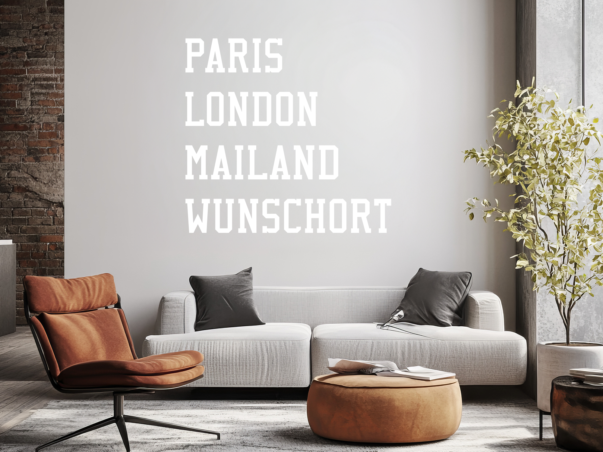 Dank diesem Wandtattoo wird der eigene Wunschort von nun an mit den ganz großen Modemetropolen Paris, London und Mailand in einem Atemzug genannt. Einfach die gewünschte Stadt ins Wunschtext Feld eingeben und schon ist der individuelle Aufkleber für die Wand fertig. Es war noch nie so einfach, dem eigenen Zuhause Persönlichkeit einzuhauchen und es auf stylische Art und Weise zu verschönern.