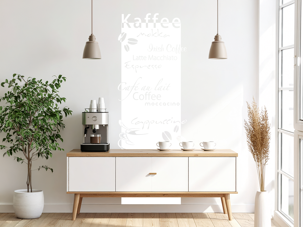 Alle Kaffeeliebhaber werden von diesem Wandtattoo Banner begeistert sein. Latte Macchiato, Moccacino, Espresso und viele andere Kaffee-Variationen machen Ihre Wand zum absoluten Highlight. Eine wundervolle Wanddekoration für die Küche und den Essbereich, die schnell und einfach befestigt werden kann. Die seidenmatte Dekofolie wirkt sehr edel und zieht alle Blicke auf sich. Gestalten Sie Ihr Zuhause ganz individuell und nach Ihrem persönlichen Geschmack. Bestellen Sie dieses außergewöhnliche Kaffee Wandbanner noch heute in unserem Shop. Sie werden von der Wirkung des Aufklebers begeistert sein.