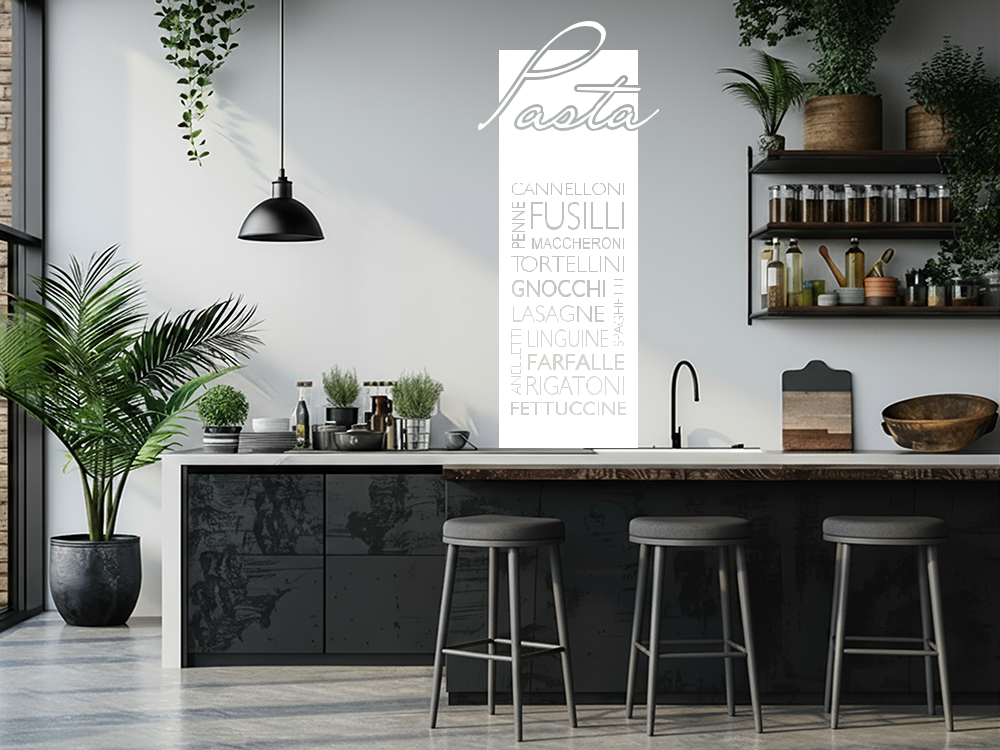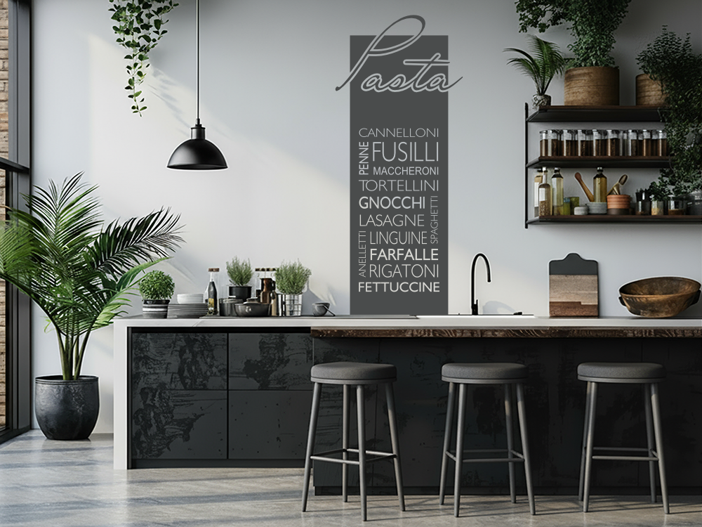 Verzaubern Sie Ihre Küche oder Ihren Essbereich mit dem schönen Wandbanner Pasta. Das modern gestaltete Wandtattoo ist ein toller Blickfang an jeder Wand und verleiht dem Raum ein neues Erscheinungsbild. Die verschiedenen Schriftarten in diesem Wandbanner sorgen für eine moderne Optik. Mit nur wenigen Handgriffen können Sie Ihre Küche ganz individuell gestalten und sich einfach wohlfühlen. Ihre Gäste werden Augen machen!