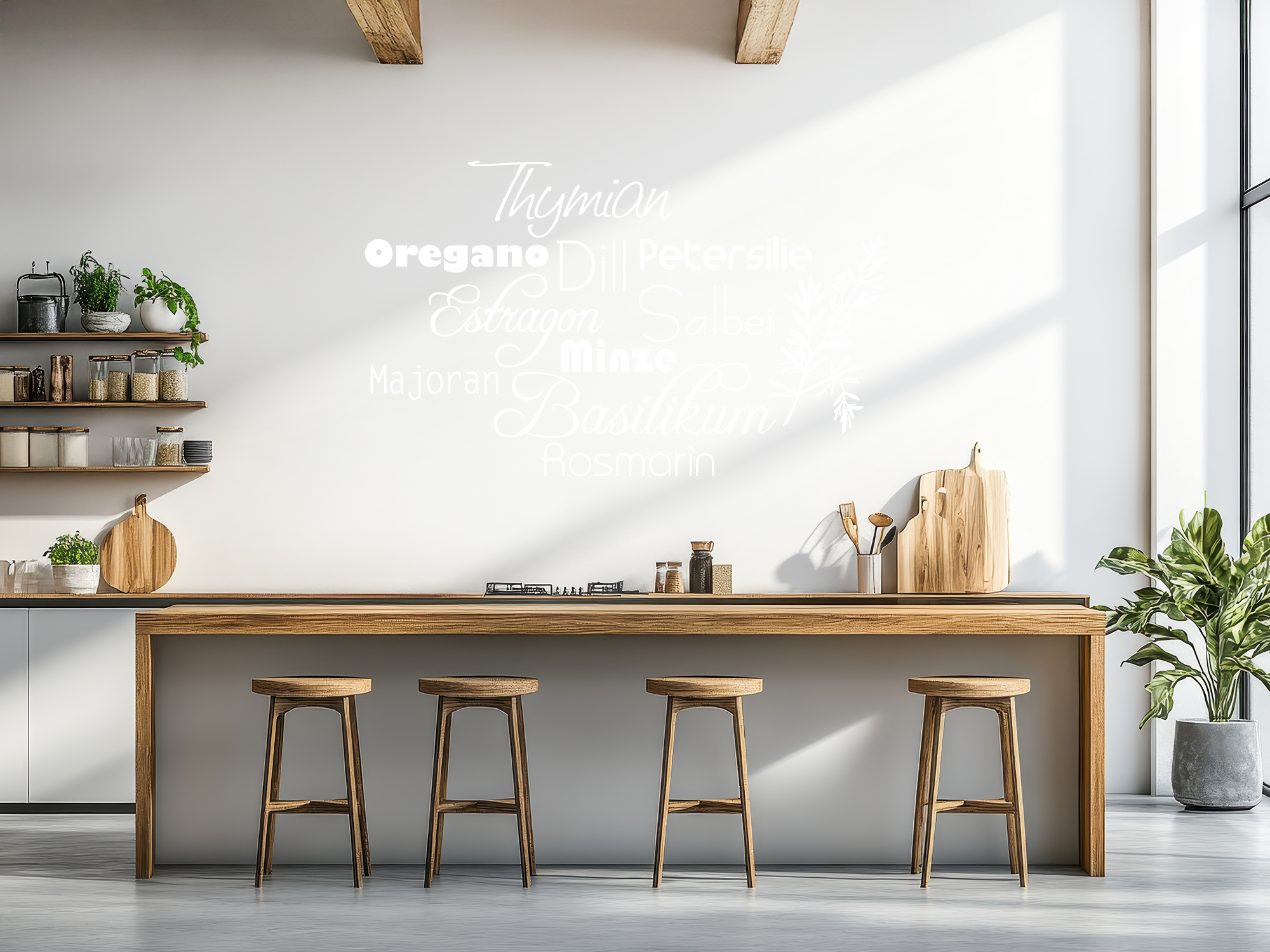 Bereits beim Anblick dieses Wandtattoos kann man den Duft der Kräuter riechen. Thymian, Estragon, Oregano, Salbei, Minze und Rosmarin sind nur einige der Kräuter-Sorten, die diese wunderschöne Wortwolke schmücken. Gestalten Sie Ihre Küchenwand und verleihen Sie Ihrem Raum ein ganz besonderes Ambiente. Familie, Freunde und Besucher Ihrer Kräuterküche werden begeistert sein. Sie können die Begriffe wie abgebildet oder ganz individuell platzieren und sind somit völlig frei in der Wandgestaltung Ihrer Küche. Dank unserer großen Farbauswahl können Sie Ihren Wandschmuck passend zur Einrichtung bestellen und verleihen somit dem Raum die gewünschte Harmonie.