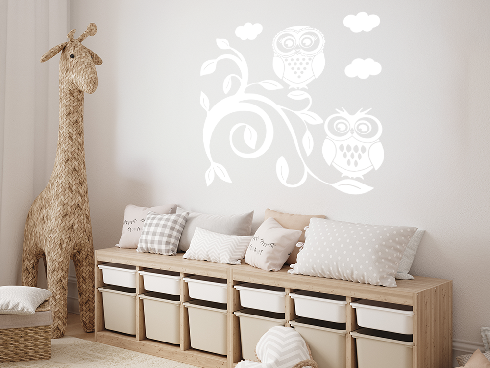 Der Anblick dieses überaus niedlichen Eulenmotivs macht sofort glücklich. Die zwei Eulen ergeben mit den Wolken und dem Ast ein wunderbares Gesamtbild, welches eine tolle Atmosphäre im Raum verbreitet. Das Wandtattoo sieht an der Wand aus wie aufgemalt und kann ganz nach Wunsch platziert werden. Ganz hervorragend eignet sich dieses Wandtattoo für das Kinderzimmer, denn es bereichert dieses im Handumdrehen mit seinen niedlichen Formen und der fröhlichen Ausstrahlung. Groß und Klein sind von diesen putzigen Eulen begeistert. Die selbstklebende, erstklassige Folie ist konturgeschnitten und hat keinen transparenten Hintergrund.