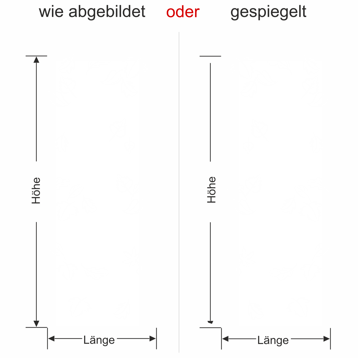 Tragen Sie eines der beiden Maße in der Bestellmaske in die Kästchen „Länge“ oder „Höhe“ ein. Das zweite Maß errechnet sich automatisch proportional, um ein Verziehen Ihres Motives zu verhindern.