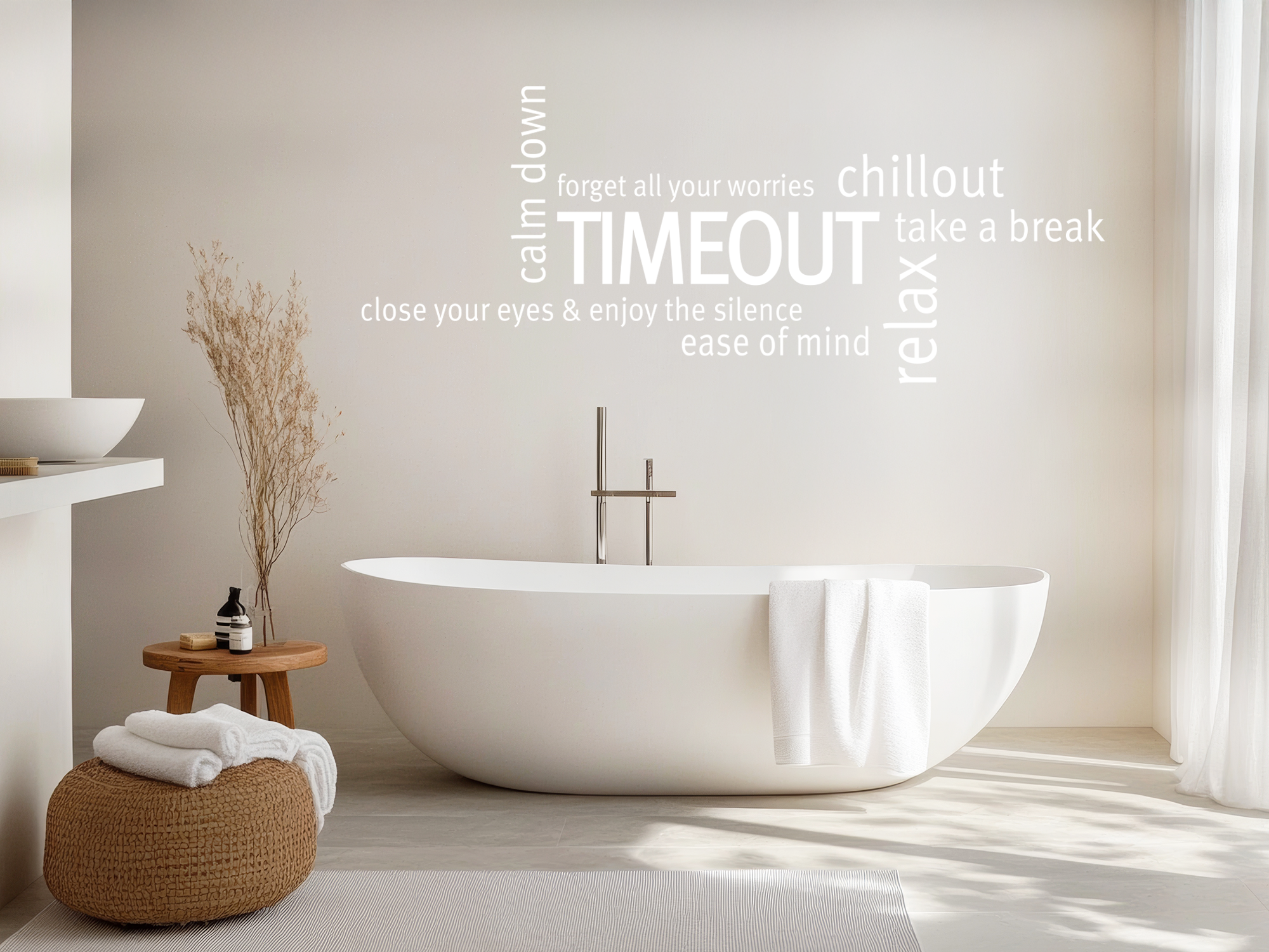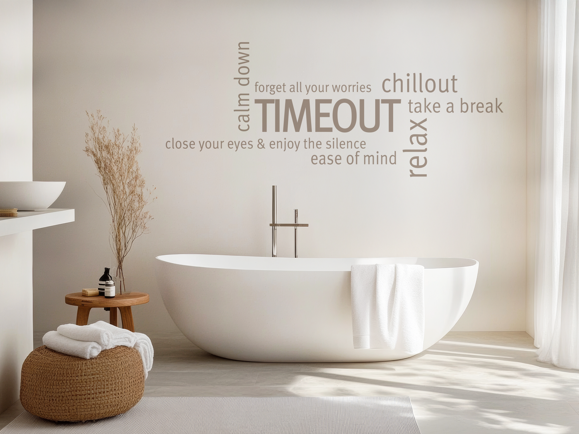 Das Wandtattoo “Timeout” eignet sich besonders gut, um im eigenen Wohnraum eine kleine Wohlfühloase zu integrieren. Wortphrasen wie „Chillout“, „take a break“, „calm down“ oder „ease of mind“ fordern jeden Betrachter dazu auf, die Seele einmal baumeln zu lassen. Lassen auch Sie sich von den Wandbegriffen mit in die Auszeit nehmen, tanken Sie Kraft und beruhigen Sie sich. Gönnen Sie sich mit diesem Wandtattoo eine Pause, kommen Sie runter und genießen Sie die Leichtigkeit des Geistes. Dieser Aufkleber für die Wand ist nicht nur fürs Bad geeignet, sondern kann auch im Schlafzimmer das Ambiente verbessern.