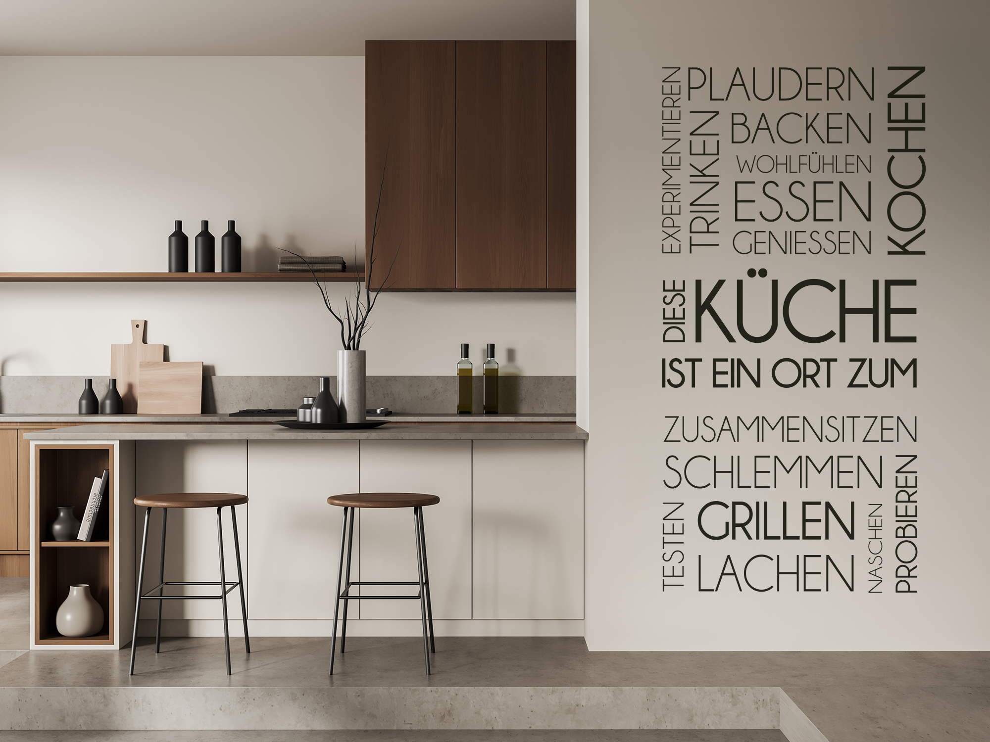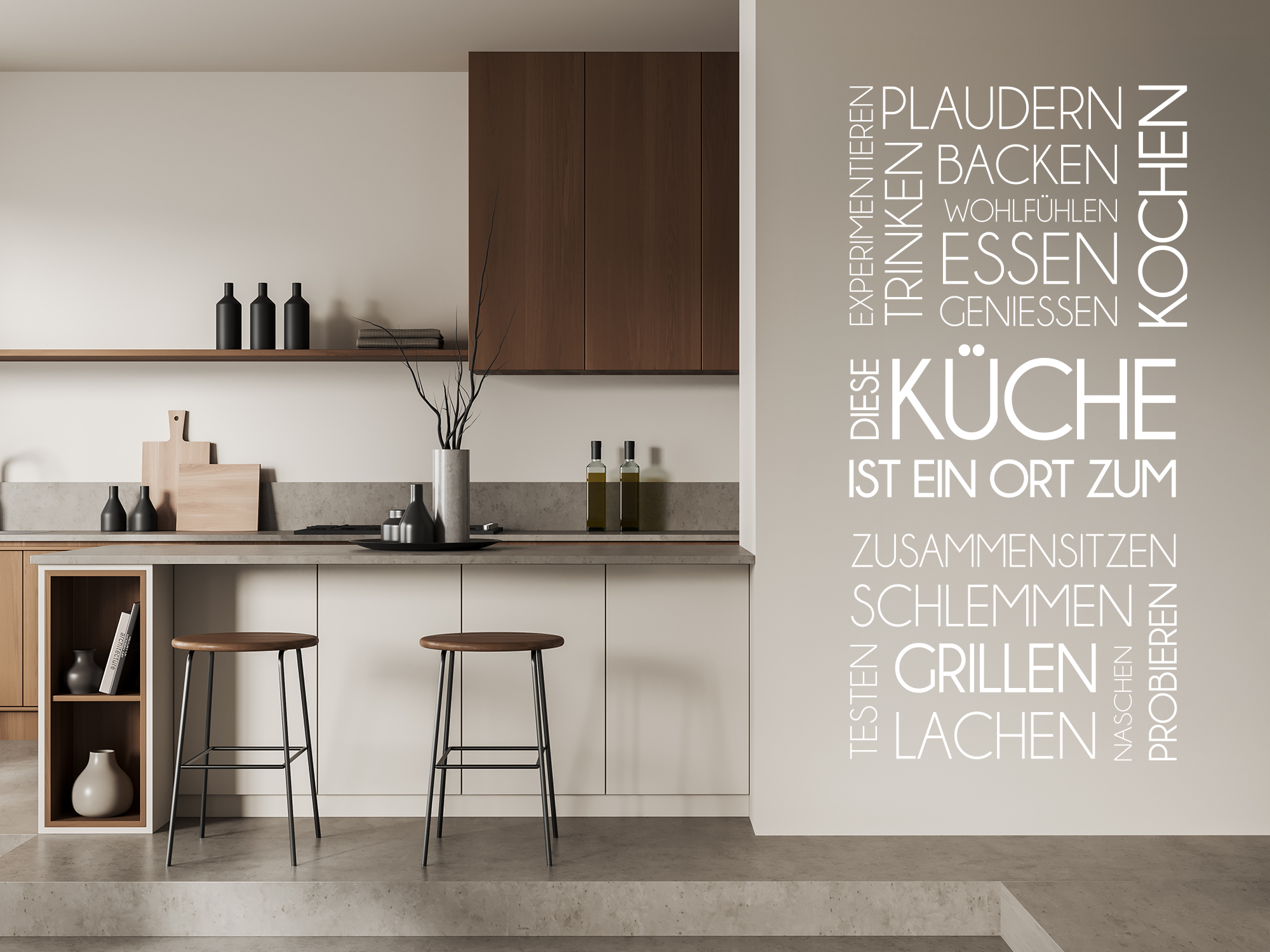 Wenn man gerne kocht, backt und neue kulinarische Kreationen ausprobiert, verbringt man sehr viel Zeit in der Küche. Folglich sollte diese auch ein Ort sein, an dem man sich gerne aufhält. Mit dieser modernen Wandtattoo Wortwolke ist es ganz einfach sich solch einen Ort zu schaffen und die Küche zum Herz des Hauses werden zu lassen. Der gradlinig gestaltete Aufkleber passt zu allen Einrichtungsstilen und bietet die Möglichkeit, die Küche von einer ganz neuen Seite zu präsentieren. Denn man sollte hier nicht nur an arbeiten denken, sondern sich vor allem auch wohlfühlen und das Zusammensein genießen.