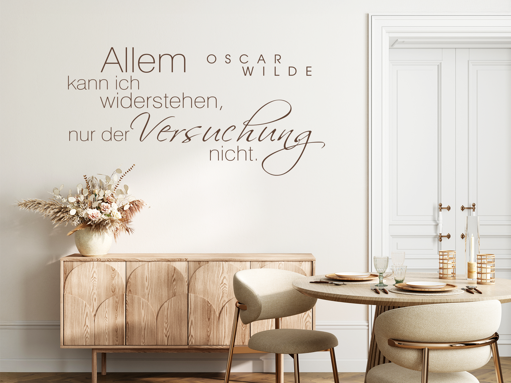 Dieses wundervolle Zitat von Oscar Wilde ist als Aufkleber für die Wand eine tolle Dekorationsmöglichkeit. Es verleiht dem Raum ein außergewöhnliches Ambiente und zieht alle Blicke auf sich. Egal ob im Wohnzimmer, im Essbereich oder im Schlafzimmer, dieser Wandaufkleber ist immer und überall ein Hingucker. Durch seine schnelle Montage erhalten Ihre Räume im Handumdrehen eine neue Optik.
