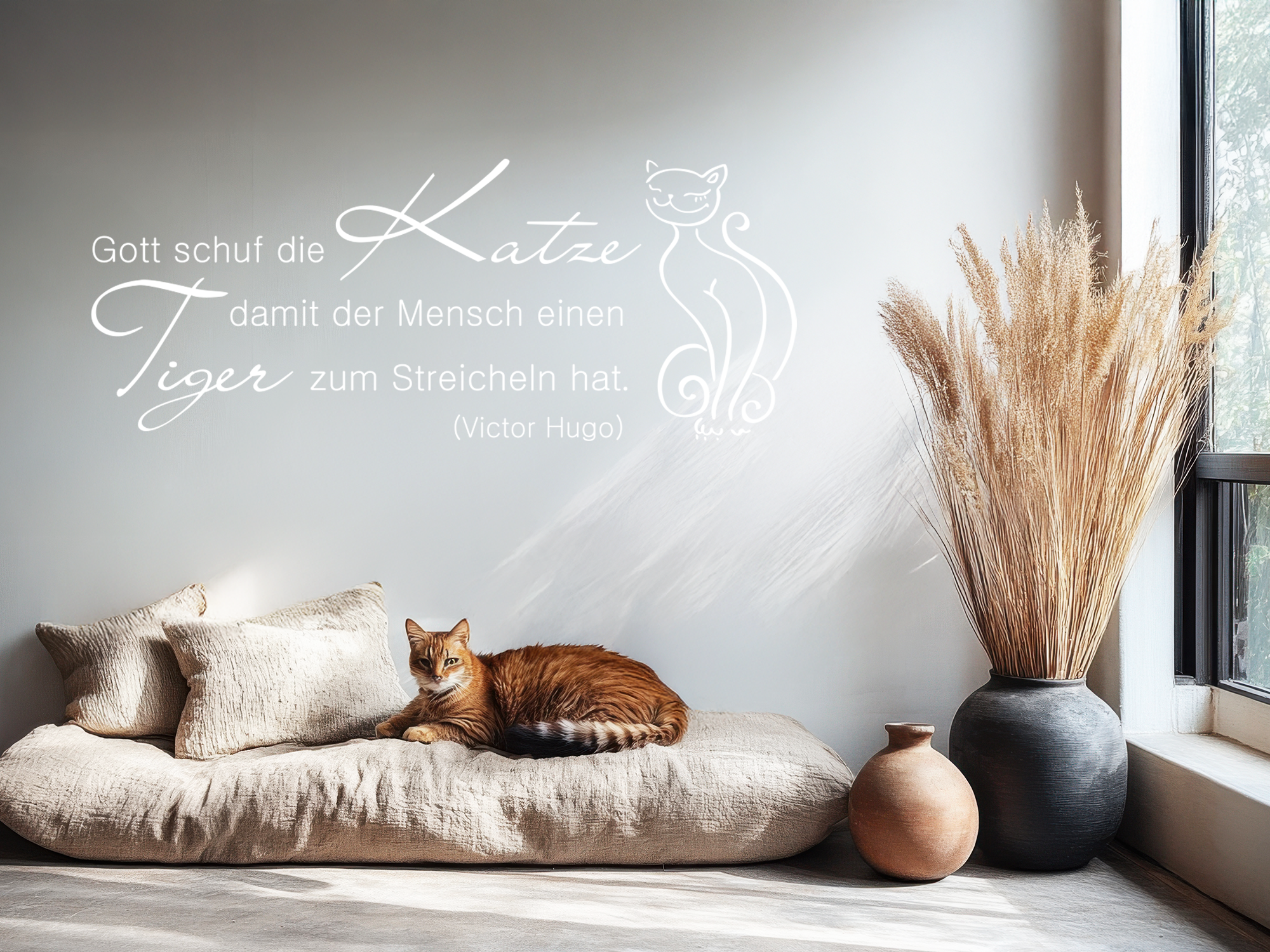 Wandzitat über Gott und Katzen als Wandschmuck verwenden: Mit dem Zitat „Gott schuf die Katze damit der Mensch einen Tiger zum Streicheln hat“ von Victor Hugo als Wandtattoo können Sie Ihre Tierliebe überall in der Wohnung kundtun. Ganz egal, ob Sie mit dem Wanddesign einen Flur oder Eingangsbereich ansprechend gestalten möchten, ob Sie das Wohnzimmer mit einem Highlight versehen wollen oder etwa das Schlafzimmer optisch aufgewertet werden soll. Dieses Wandtattoo mit dem Zitat eines berühmten französischen Schriftstellers können Sie ganz nach eigenem Wunsch an eine Wand bringen. Verschiedenste Einrichtungsstile und Dekoideen lassen sich damit kombinieren, sodass Sie sich ein tolles Ambiente schaffen, das seinesgleichen sucht.